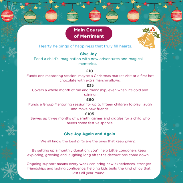 This season, you can make a real difference. Explore our Giving Menu below to see how you can support our Little Londoners with laughter, belonging, and brighter days ahead.